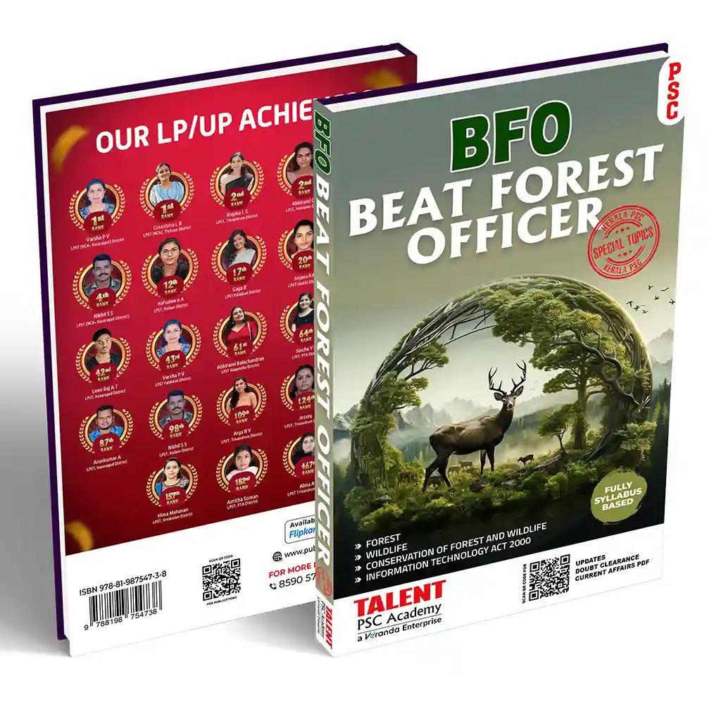 This book, published by Talent PSC Academy, is tailored to cover the latest syllabus and includes a wide range of topics to ensure thorough preparation for the upcoming Beat Forest Exam. Each module in the Beat Forest Officer Special Topic is structured to give you maximum learning with minimal confusion.
