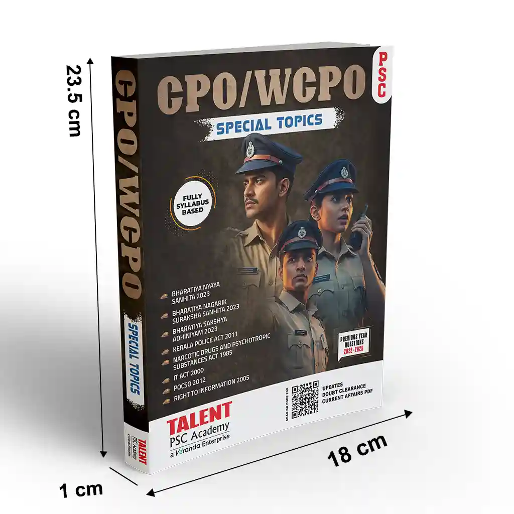 CPO SPECIAL TOPIC BOOK from Talent PSC Academy is a comprehensive study material that can be used to score 20/20 marks in the special topics section of CPO/WCPO examinations. Serving as a self-study material, this book contains syllabus-wise contents, previous year questions and practice questions.