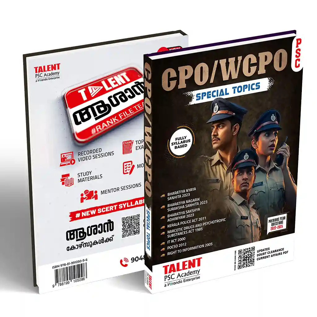 CPO SPECIAL TOPIC BOOK from Talent PSC Academy is a comprehensive study material that can be used to score 20/20 marks in the special topics section of CPO/WCPO examinations. Serving as a self-study material, this book contains syllabus-wise contents, previous year questions and practice questions.